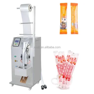 Máquina automática de llenado y sellado de bolsas de agua y pasta líquida.