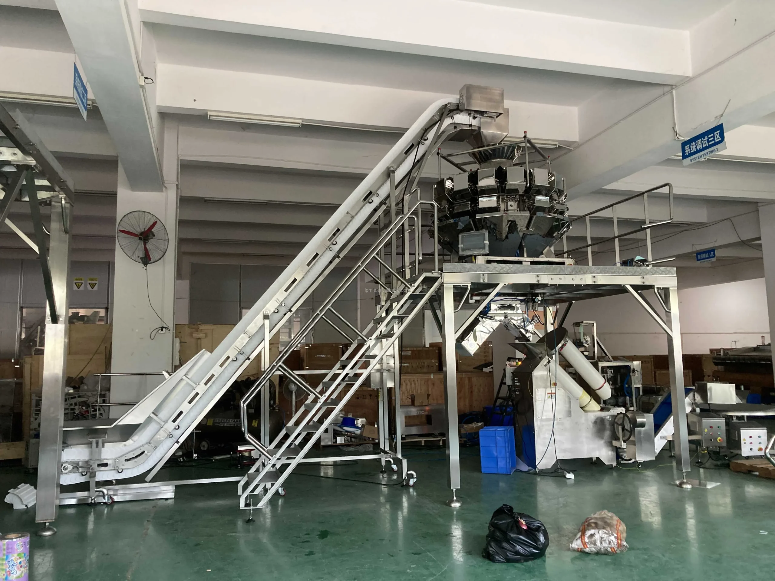 El flujo de trabajo es el siguiente: después de la clasificación manual de los productos, la cinta transportadora donde se colocan los materiales en el medio se envía a la máquina empacadora de bolsas de red mediante la cinta transportadora elevadora, y la etiqueta establecida se imprime automáticamente cuando se completa el empaquetado automático. El enmarcado manual se realiza para completar el empaquetado estandarizado de los productos.